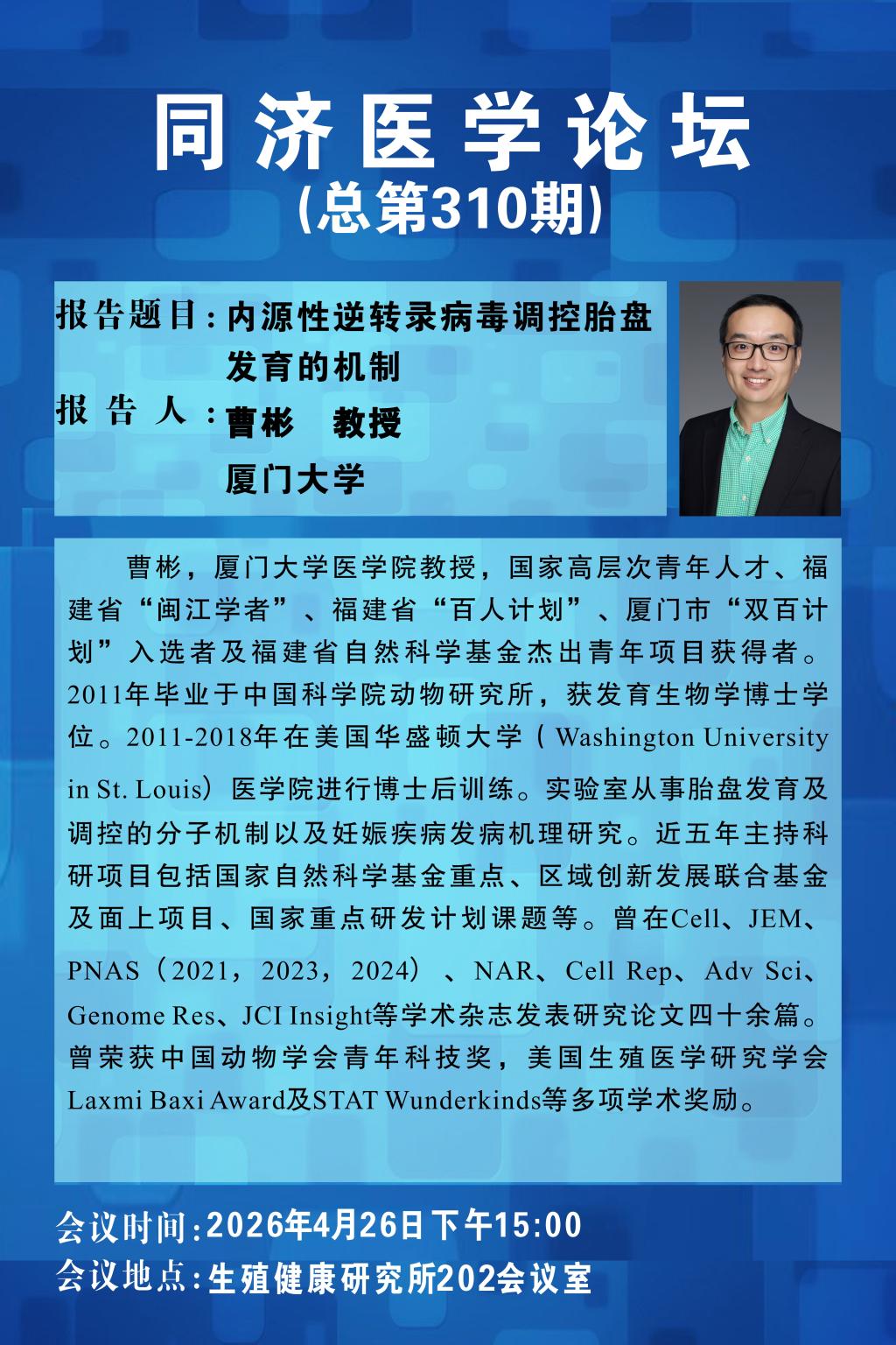 报告题目 内源性逆转录病毒调控胎盘发育的机制 报告人 曹彬 厦门大学教授