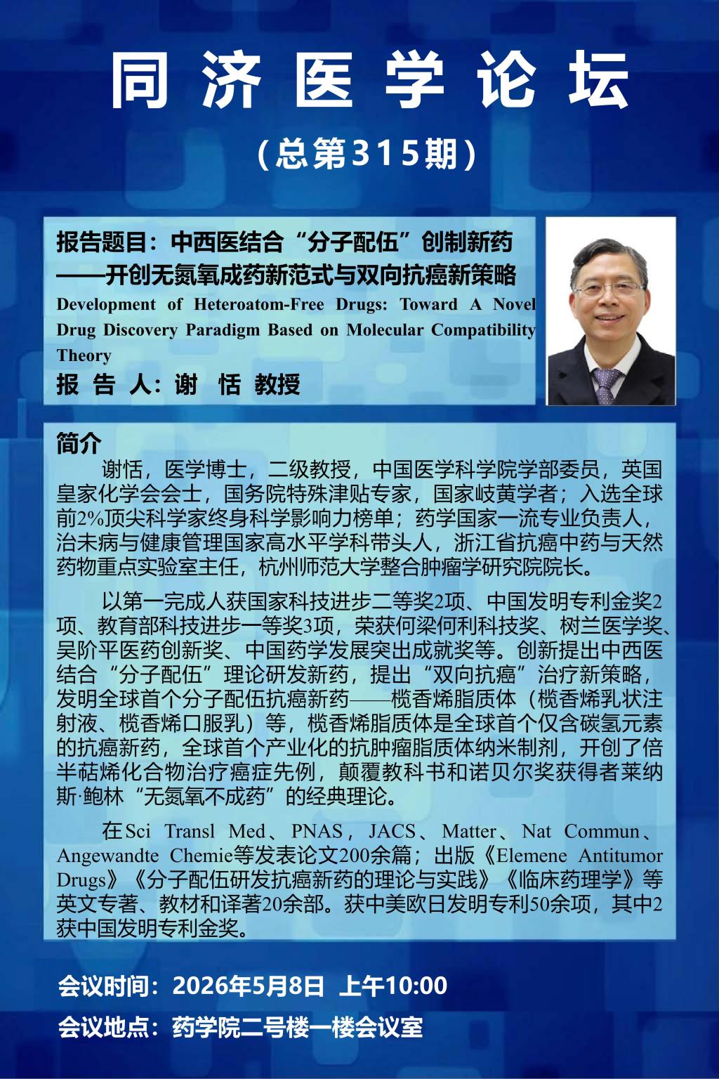 报告题目 中西医结合“分子配伍”创制新药-开创无氮氧成药新范式与双向抗癌新策略 报告人 谢恬 中国医学科学院学部委员、杭州师范大学整合肿瘤学研究院院长