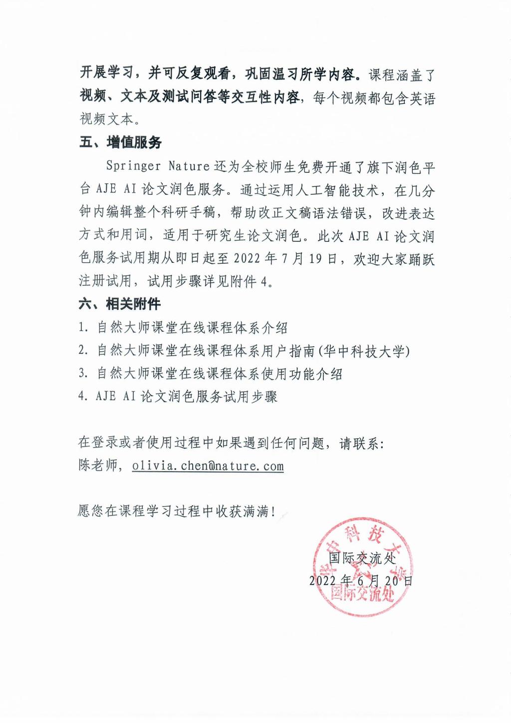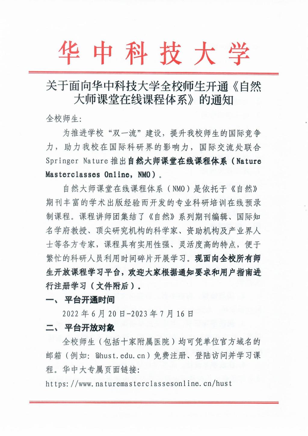 关于面向华中科技大学全校师生开通自然大师课堂在线课程的通知