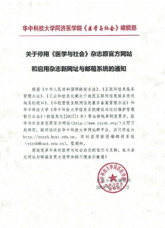 关于停用《医学与社会》杂志原官方网站和启用杂志新网址与邮箱系统的通知