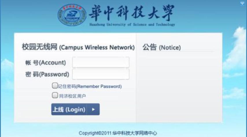 华中科技大学校园无线网已实现主校区和同济校区账号自动漫游,即同济校区无线网用户可以在主校区使用同济校区账号登录校园网络,主校区无线网用户可以在同济校区使用主校区账号登录校园网络,具体使用方法如下:(以同济校区用户为例)