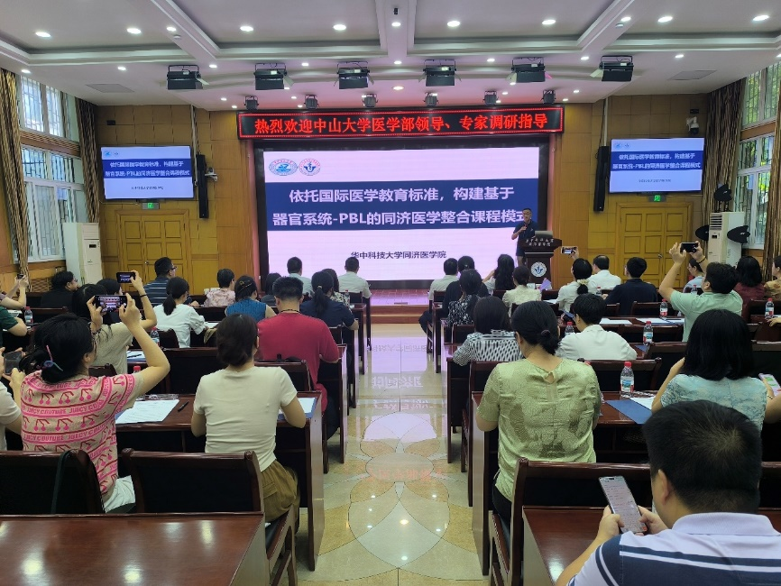在裘法祖学术报告厅,本科生院副院长、医学教务处处长向明主持见面会,舒晓刚副院长对中山大学同仁的到访表示诚挚欢迎,总体介绍了同济医学院的历史、办学定位、人才培养、教学改革等基本情况,并回顾了两校的深厚情谊。接着王淑珍副处长对我校的热情接待表示感谢,也对此次调研工作充满信心。随后,医学教务处副处长舒涛介绍了同济医学院整合课程模式改革。