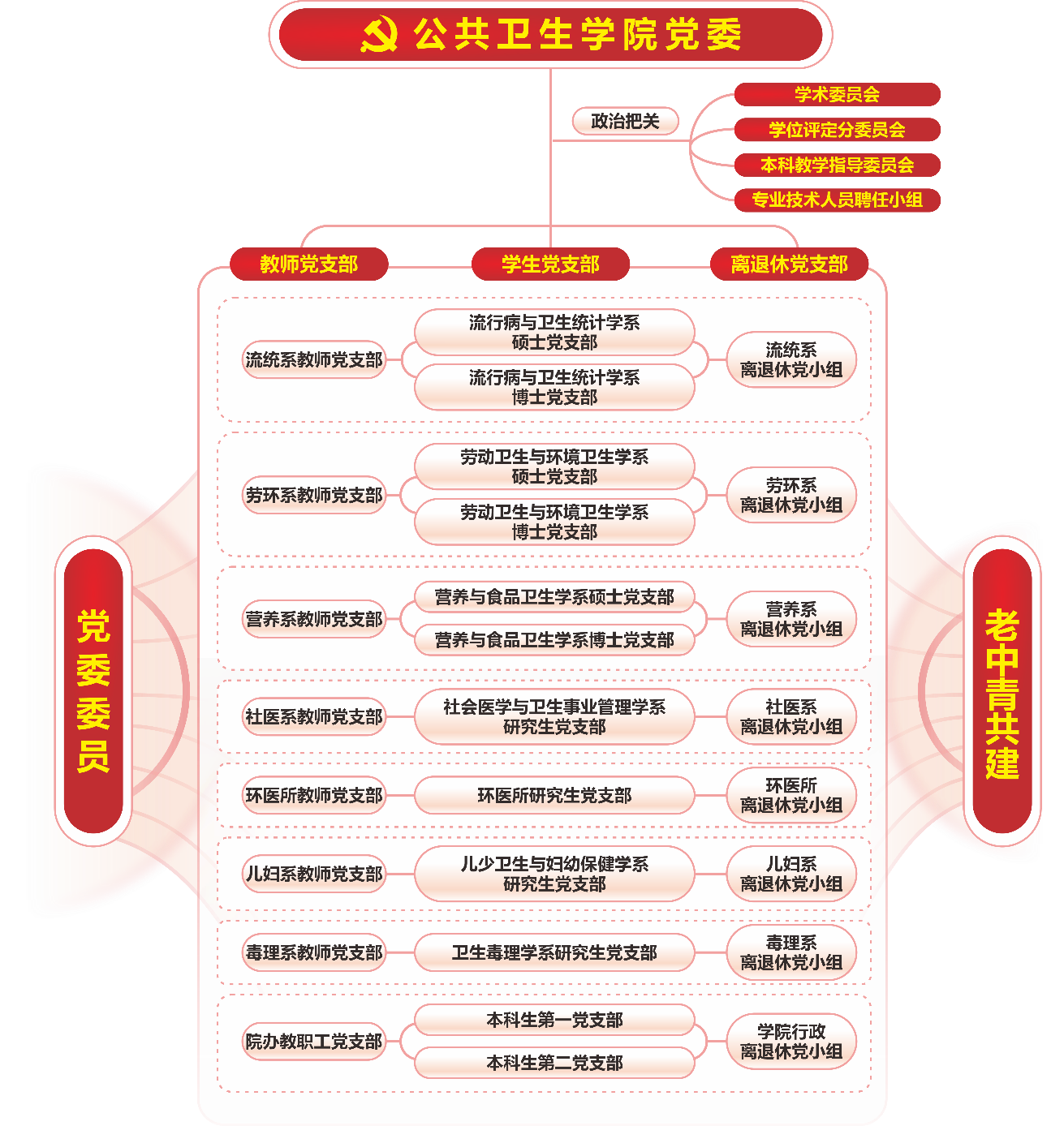 公卫学院党委成立于2015年,现设有21个党支部,其中教职工党支部9个(含离退休党支部1个),本科生党支部2个,研究生党支部10个,党员673名,其中正式党员628名。学院党委以习近平新时代中国特色社会主义思想为指导,全面落实习近平总书记关于教育和卫生健康工作的重要论述及指示精神,以党建引领与事业发展双轮驱动,在人才培养、科学研究、社会服务、国际交流等方面取得新成绩。