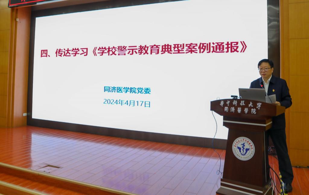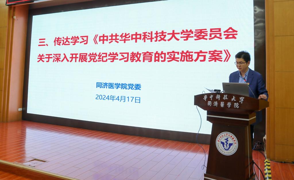 4月17日上午,同济医学院党委在医学院学术报告厅召开会议部署党纪学习教育工作,传达学习《中共华中科技大学委员会关于深入开展党纪学习教育的实施方案》和《学校警示教育典型案例通报》。会议由医学院党委副书记、纪委书记陈秋生主持,医学院院领导、党委委员及全体机关在职党员参加学习。