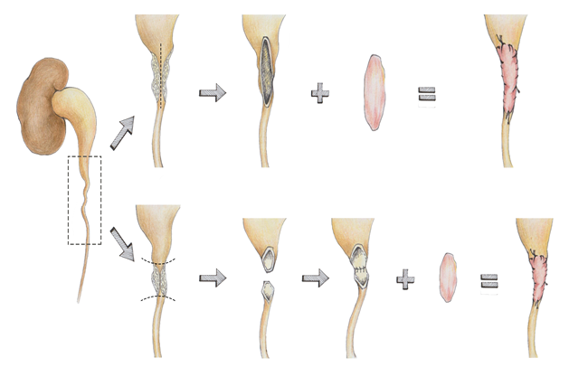 输尿管狭窄疾病是因为先天性发育不良、医源性损伤、结石嵌顿碎石和肿瘤放疗等原因,导致输尿管管腔狭窄或闭锁,进而引起不同程度肾积水、患侧肾功能受损的一类疾病的总称。对于输尿管狭窄段较短的病例可采用内镜下切开技术或输尿管端端吻合进行处理。对于中上段输尿管长段狭窄,或多发狭窄复杂病例的处理,传统治疗方式只能进行肠代输尿管或自体肾移植手术,存在手术创伤大、并发症多等缺点。最终,大部分患者不得不接受体内长期留置引流管,或者肾造瘘佩带尿袋持续引流尿液,这些姑息性治疗方法可出现顽固的泌尿系感染、结石形成、活动后血尿,严重影响患者生活质量。长段输尿管狭窄重建是临床治疗的难点,传统方式只能使用肠代输尿管甚至自体肾移植。临床研究一直寻找方法来替代,目前可以用的有阑尾替代输尿管,超长膀胱瓣代输尿管。而口腔粘膜补片修复输尿管技术,难度低,损伤小,成功率高,目前逐渐被学界认可,并在国内外广泛推广。