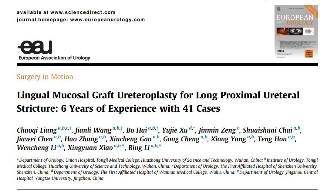 5月23日,同济医学院附属协和医院泌尿外科李兵教授团队在泌尿外科学界顶级期刊European Urology(IF:20.096)发表了题为“Lingual mucosal graft ureteroplasty for long proximal ureteral stricture: six years of experiences with 41 cases”的临床研究论文。协和医院泌尿外科、同济医学院泌尿外科研究所李兵教授、肖行远副教授为论文通讯作者,梁超启、王建黎博士,海波、徐玉节主治医师为共同第一作者。European Urology两位审稿人对该创新手术给以高度评价,在文章框架和数据层面给予充分肯定。