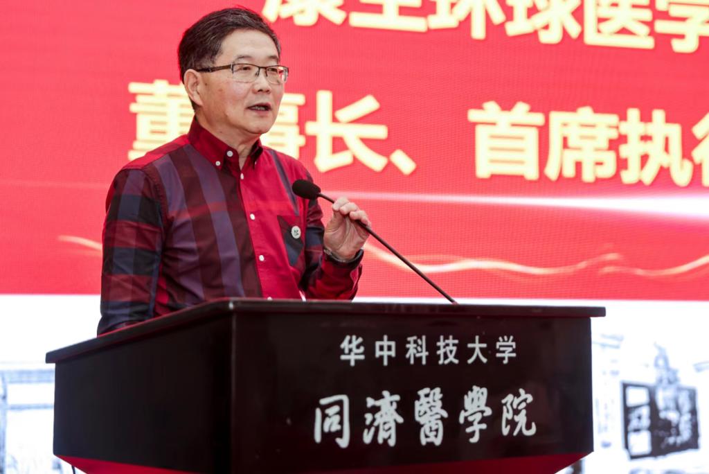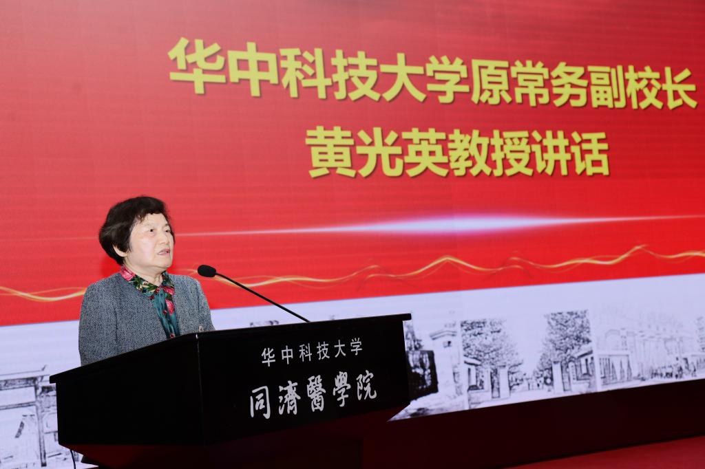黄光英作为老领导代表讲话。她表示,同济医学院的历史是一部奋斗史和奉献史。无论是在战火纷飞的年代,还是在颠沛流离的跋涉中;无论是在医学改革和科教兴国的最前沿,还是在抗击疫情的最前线,同济人始终恪守“与祖国同行,以医学济世”和“团结、严谨、求实、奋进”的优良传统,为守护国家和人民的生命健康作出重大贡献。黄光英寄语新一辈同济人踔厉奋发、笃行不怠,为早日将同济医学院建成世界一流医学院接续奋斗。
