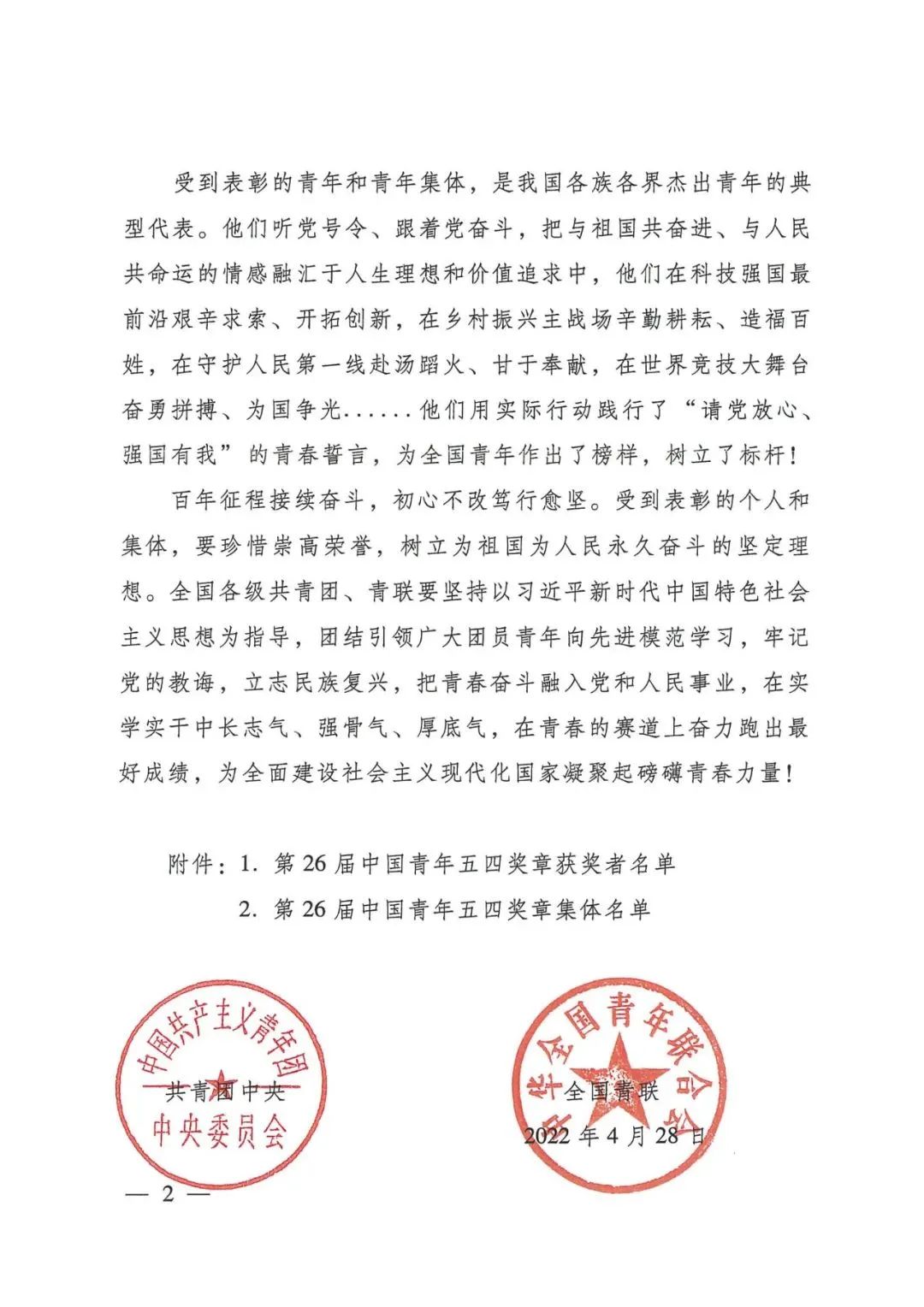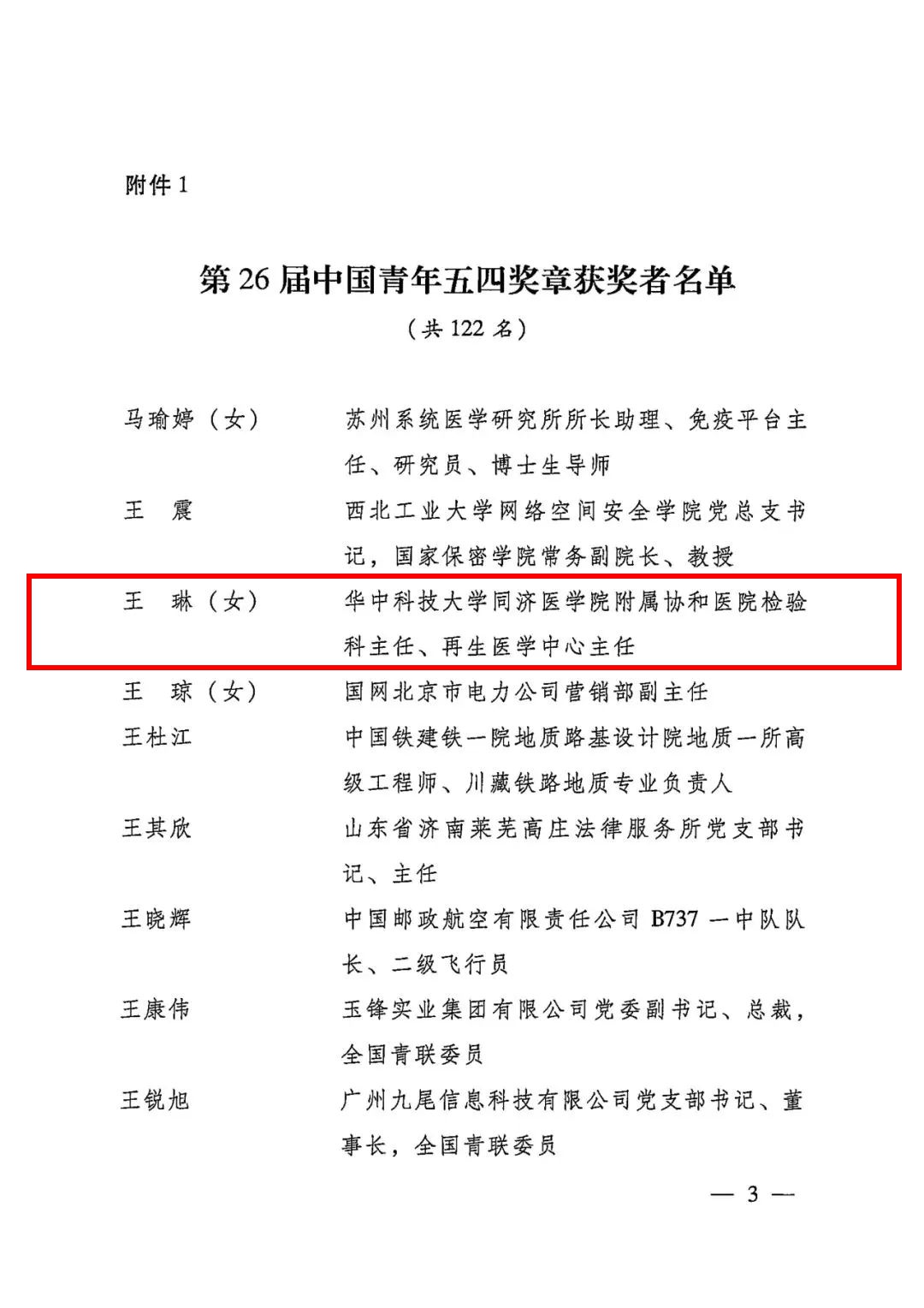 在五四青年节来临之际,共青团中央、全国青联共同颁授第26届中国青年五四奖章,表彰青年中的优秀典型和模范代表。同济医学院附属协和医院检验科主任、再生医学中心主任王琳获此殊荣!