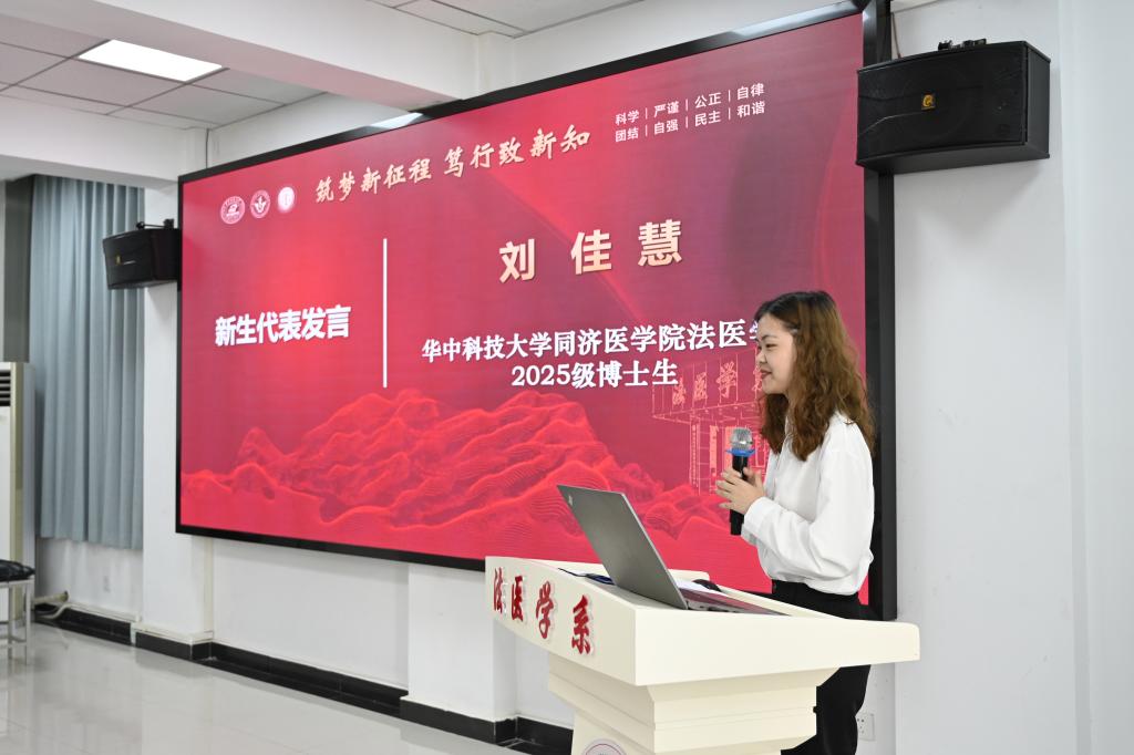2025级博士研究生刘佳慧作为新生代表发言,以“为死者言,为生者权”的法医精神为引,承诺全体新生将以校友为榜样,永葆初心、勇于探索,携手追求卓越,开启人生新征程。