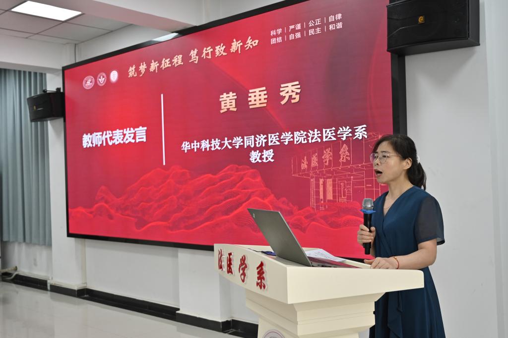 导师代表黄垂秀教授对新生加入法医学系大家庭表示了衷心的祝贺和热烈的欢迎。她指出“导师与学生是荣辱与共的师生共同体”,鼓励大家坚守学术初心,在同济校园锤炼过硬本领,书写青春华章。