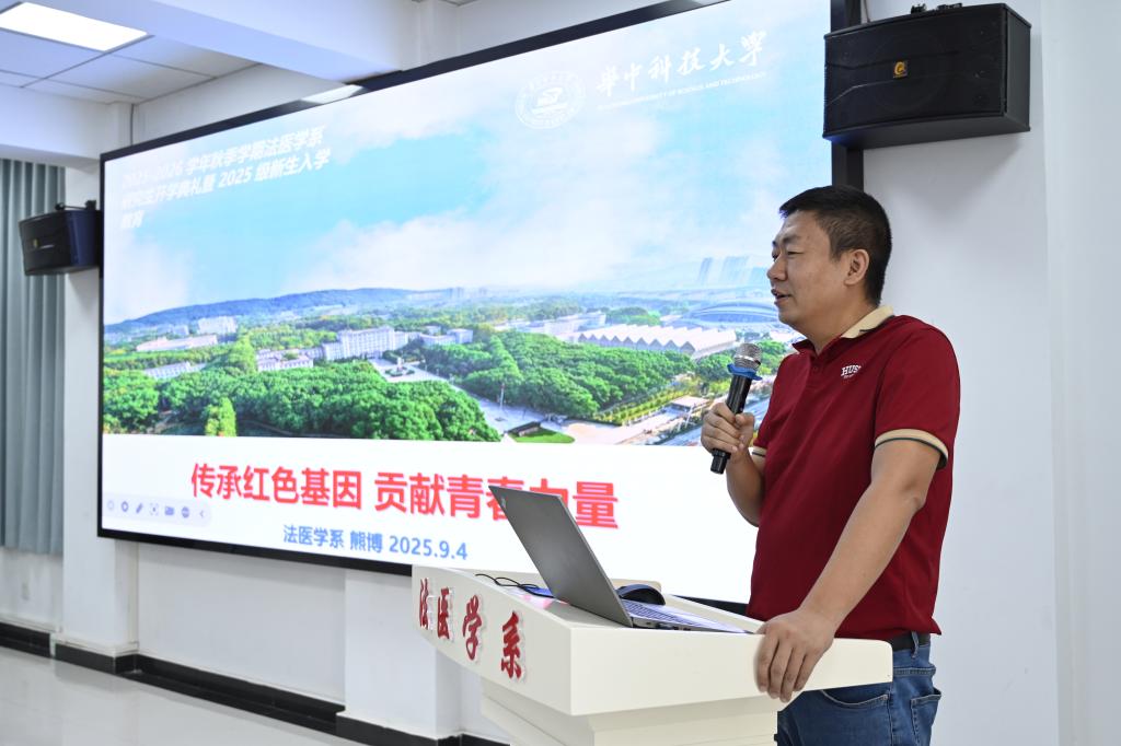熊博主任以“传承红色基因,贡献青春力量”为主题,回顾了华中科技大学及法医学系的发展历程与先辈贡献,强调研究生阶段是实现从“知识学习者”到“知识创造者”跃升的关键时期。他寄语新生传承“艰苦奋斗、无私奉献”的优良传统,立志成为服务国家战略需求的法医栋梁。