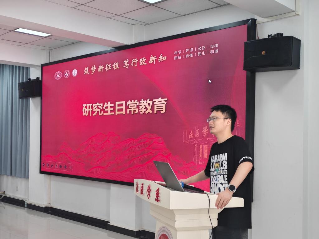 刘茜副主任围绕“学术道德”主题,结合近期学术不端案例,剖析论文发表中的风险,强调“系好学术科研第一颗纽扣”的重要性,提醒新生“踏实做人、认真做事,方能行稳致远”。