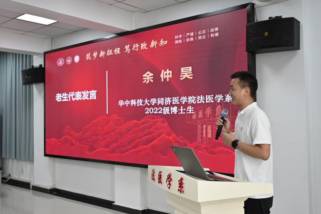 2022级博士研究生余仲昊作为老生代表发言,他勉励大家将个人理想融入国家发展,勤于交流、善于思考、勇于实践,在充满挑战的科研道路上不断实现自我超越,努力成为国家可堪大任、值得信赖的青年力量,成为有担当、有本领,值得信赖的同济法医人。