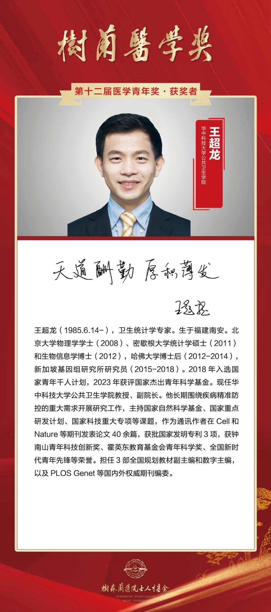 公共卫生学院王超龙教授荣获第十二届“树兰医学青年奖”