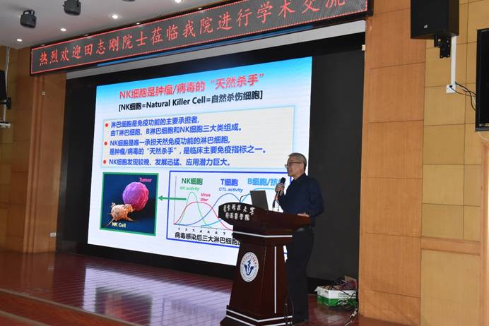 4月16日,中国工程院院士,医学免疫学家,中国免疫学会理事长,中国科学技术大学田志刚教授做客第148期同济医学论坛,给同济医学院师生带来了一场题为“NK细胞与免疫治疗”的精彩学术报告。田志刚院士博闻强识,幽默风趣,尽显大家风范。论坛由免疫学系杨想平教授主持,华中科技大学党委常委、副校长,同济医学院党委书记、院长陈建国教授,基础医学院免疫学系全体教师,同济医学院各单位、附属同济医院和协和医院相关专业科研人员,各年级研究生参与了交流。