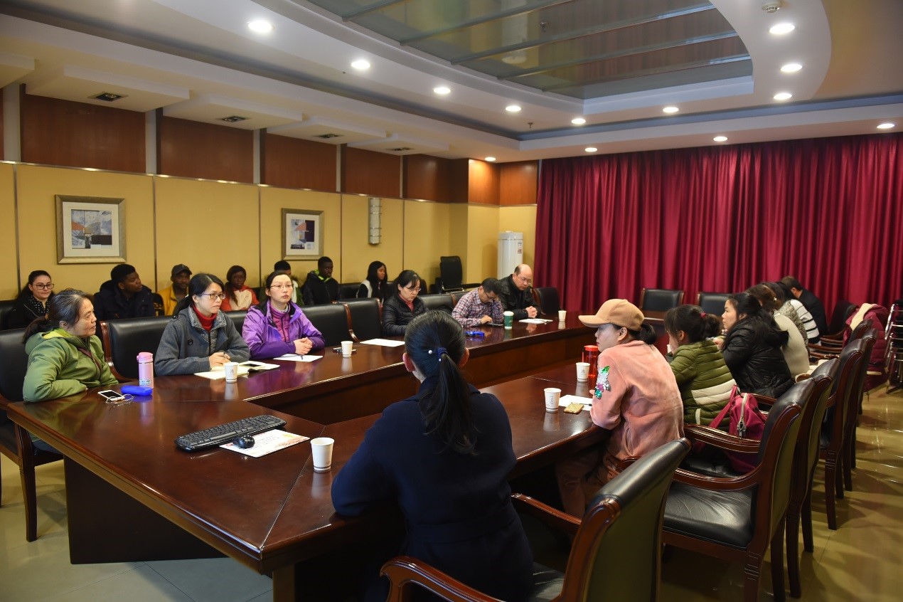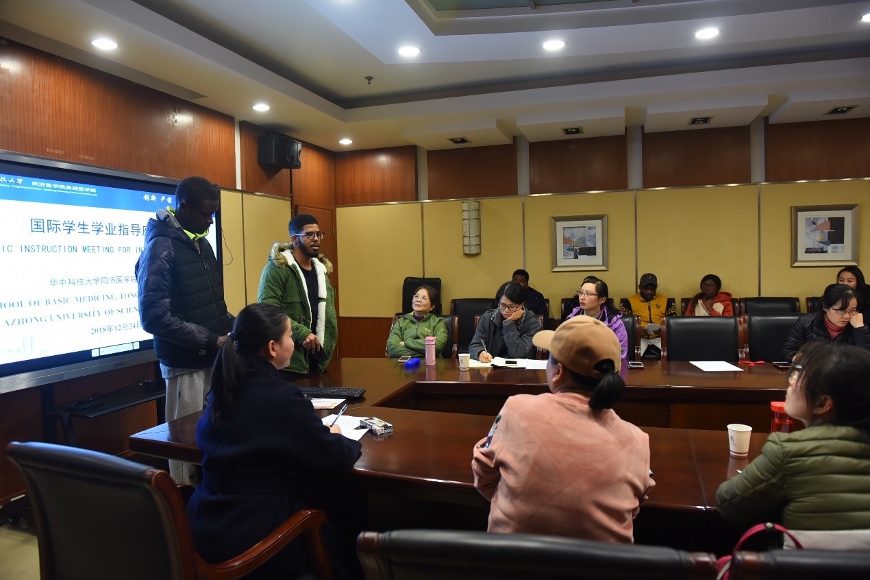 20181224日下午,基础医学院召开了国际学生本科生学业指导座谈会。基础医学院教学办公室主任晏汉姣,国际教育学院医科来华留学办公室主任洪涛、秦尔川老师、骆美颖老师,基础医学院生化系教授孙军、副教授过健俐、教师刘琳,病生系副教授吴萍,组胚系副教授王小丽、教师叶翠芳,药理系副教授汤强,解剖系教师彭会明,病理系教师徐惠参加会议,基础医学院国际学生辅导员陈曦主持会议。