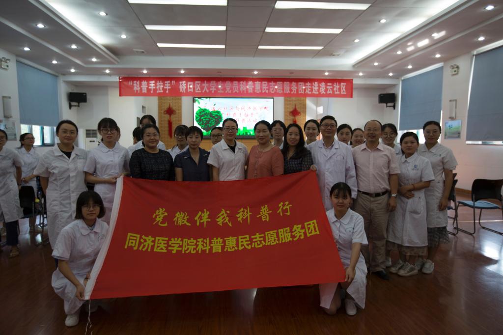 915日上午,由硚口区科协主办、华中科技大学同济医学院护理学院承办的大学生党员科普惠民志愿服务在江汉区凌云社区开展。同济医学院护理学院李节副教授为居民开展急救知识讲座,护理学院近30名师生对现场居民进行急救知识演练培训,发放《健康科普手册》,为居民免费测量血压、血糖。同济医学院护理学院党总支书记徐晖、硚口区科协副主席冯霞、凌云社区的领导和同济医学院大学生党员科普惠民志愿服务团成员参加了活动。