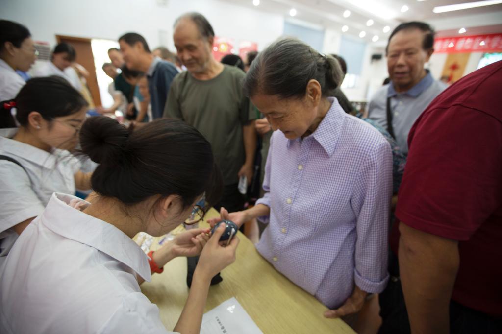科普讲座结束后,师生们分为三组现场为居民进行心肺复苏急救演练培训,免费为居民测量血压、血糖。在心肺复苏急救培训现场,居民们踊跃地参与练习,认真学习基本动作要领。对于血压和血糖值有异常的居民,志愿者们耐心地给他们进行健康宣教。现场居民对科普惠民服务团的各项服务连声道谢并不断竖起大拇指。