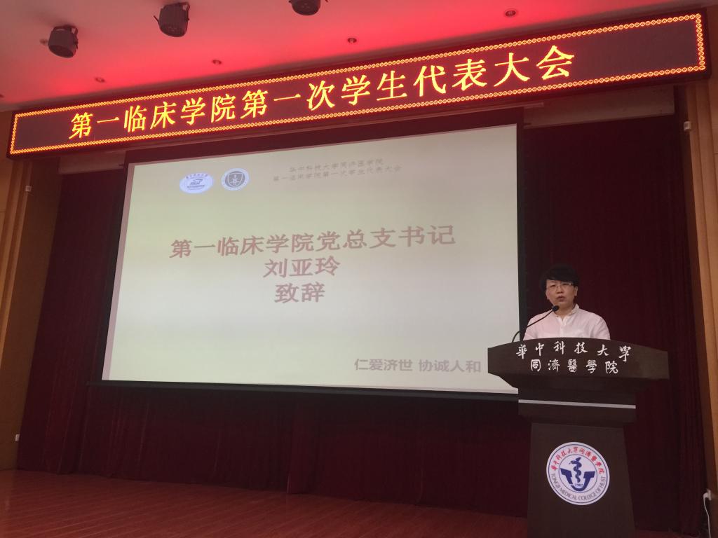 2018年5月27日14:30,华中科技大学第一临床学院第一次学生代表大会在同济医学院报告厅开幕。第一临床学院副院长季湘年、党总支书记刘亚玲、党总支副书记陈剑虹、分团委书记丁卉及辅导员李诗念老师、华中科技大学学生会常务副主席徐云宏、第十七任学生会主席团、各部门部长以及全院61名学生代表出席大会。