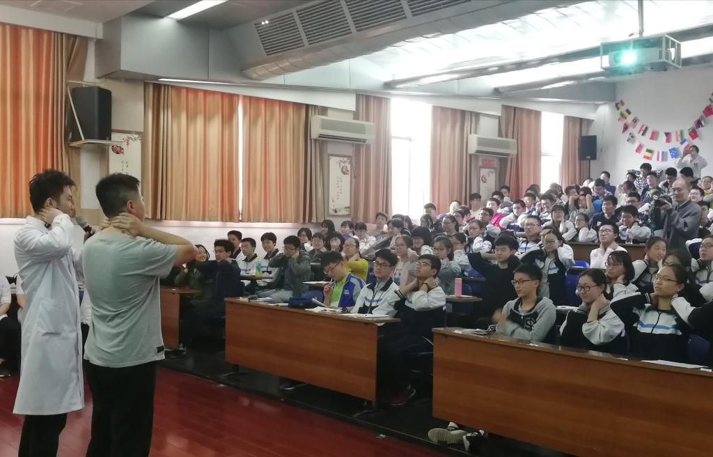下午3点50分讲座正式开始,张铮同志作为武钢三中的校友首先为学弟学妹们讲解了颈椎病的危害及防治,旨在提升课业繁重的中学生平时自我保健的能力与意识。活动中,博士生张铮身体力行示范了各种颈椎保健操,现场气氛十分活跃,得到了同学们的一致好评,大家纷纷表示收获颇丰,要将健康知识运用到生活的每一个细节中去。