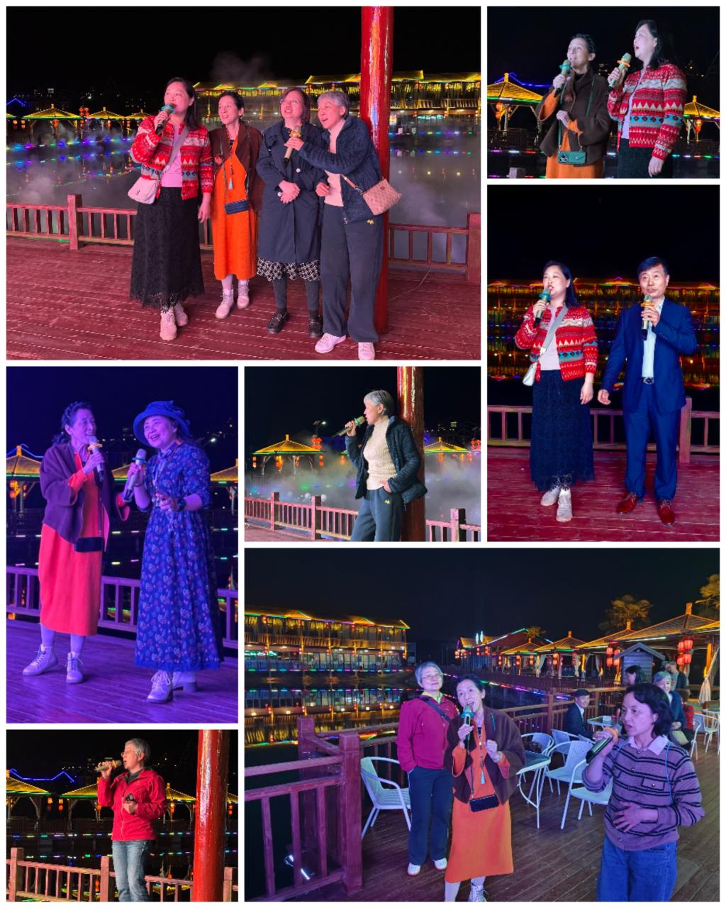 夜幕四合,灯光骤亮。大型电子屏背景绚丽开启,水幕从舞台前方喷涌而出,在五彩光影中幻化成流动的画布,烟雾缭绕间,整个场地恍若仙境。K歌环节在老会长方爱国一曲《在那桃花盛开的地方》中拉开帷幕——他手持话筒,目光深邃,歌声浑厚而饱含深情,仿佛将满园桃花唱进了每个人的心坎。掌声未落,会长方璐及李熳、倪岚、骆红艳、刘纬、李崇意、程灵等歌友纷纷登台,献唱了《我爱你中国》《主席的话儿记心上》《洪湖水浪打浪》《故乡是北京》等经典红歌,以及《世界赠与我的》、《灯火里的中国》、《萱草花》、《乌兰巴托的夜》《等你等了那么久》等流行金曲。歌声或激昂澎湃,或婉转悠扬,或深情款款,或辽阔苍茫,引来台下轻声跟唱。歌声间隙,有歌友按捺不住,即兴上台伴舞——水袖轻扬,步伐灵动,歌声与舞影在水幕灯光中交织,将夜晚的欢乐一次次推向高潮。