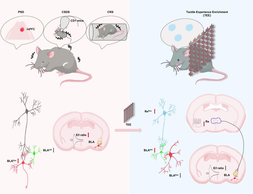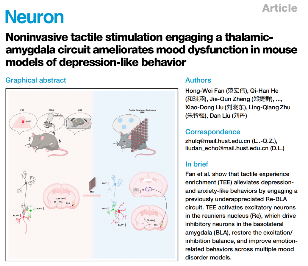 2026年4月1日,Neuron在线发表华中科技大学刘丹教授与朱铃强教授团队的最新研究。该研究发现,非侵入性的触觉丰富体验(tactile-enriched experience, TEE)能够绕过受损的内侧前额叶皮层相关通路,通过激活丘脑结合核(Re)-基底外侧杏仁核(BLA)这一替代环路,恢复BLA局部兴奋/抑制平衡,从而在多种小鼠模型中显著改善抑郁样和焦虑样行为。