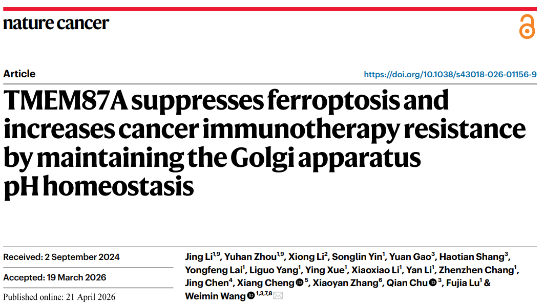4月21日,基础医学院王维民教授团队在Nature Cancer杂志上发表了题为TMEM87A suppresses ferroptosis and increases cancer immunotherapy resistance by maintaining the Golgi apparatus pH homeostasis的研究论文,揭开了高尔基体参与铁死亡调控的神秘面纱。